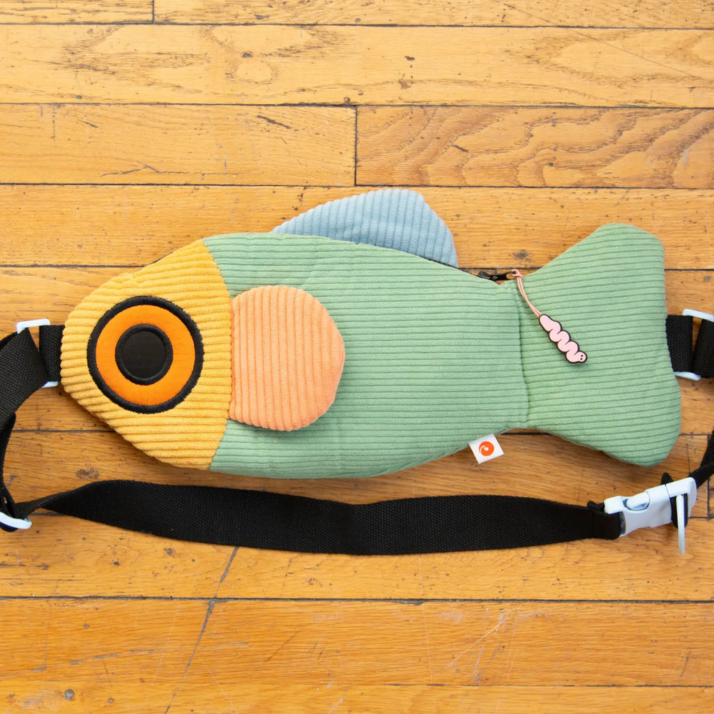 This here Fish Bag is the Fruity variety. He's 17" x 6.75" and comes with a fruity little rubber worm zipper pull, D-ring and buckle matched to the adjustable 1.5" wide cotton strap, and can be adjusted to be between ~36" - 80" long (91cm x 203cm) (including the length of the bag) with the included strap-extender. He can be worn as a crossbody or a (large) fanny pack. The interior is lined with a durable cream-colored cotton canvas tastefully flecked with multicolored 'funfetti sprinkles'. The large main pocket extends the entire length of the fish and is big enough for a standard sized water bottle, Nintendo Switch, or small journal. A smaller interior pocket is great for your wallet, phone, or your pencils and pens.