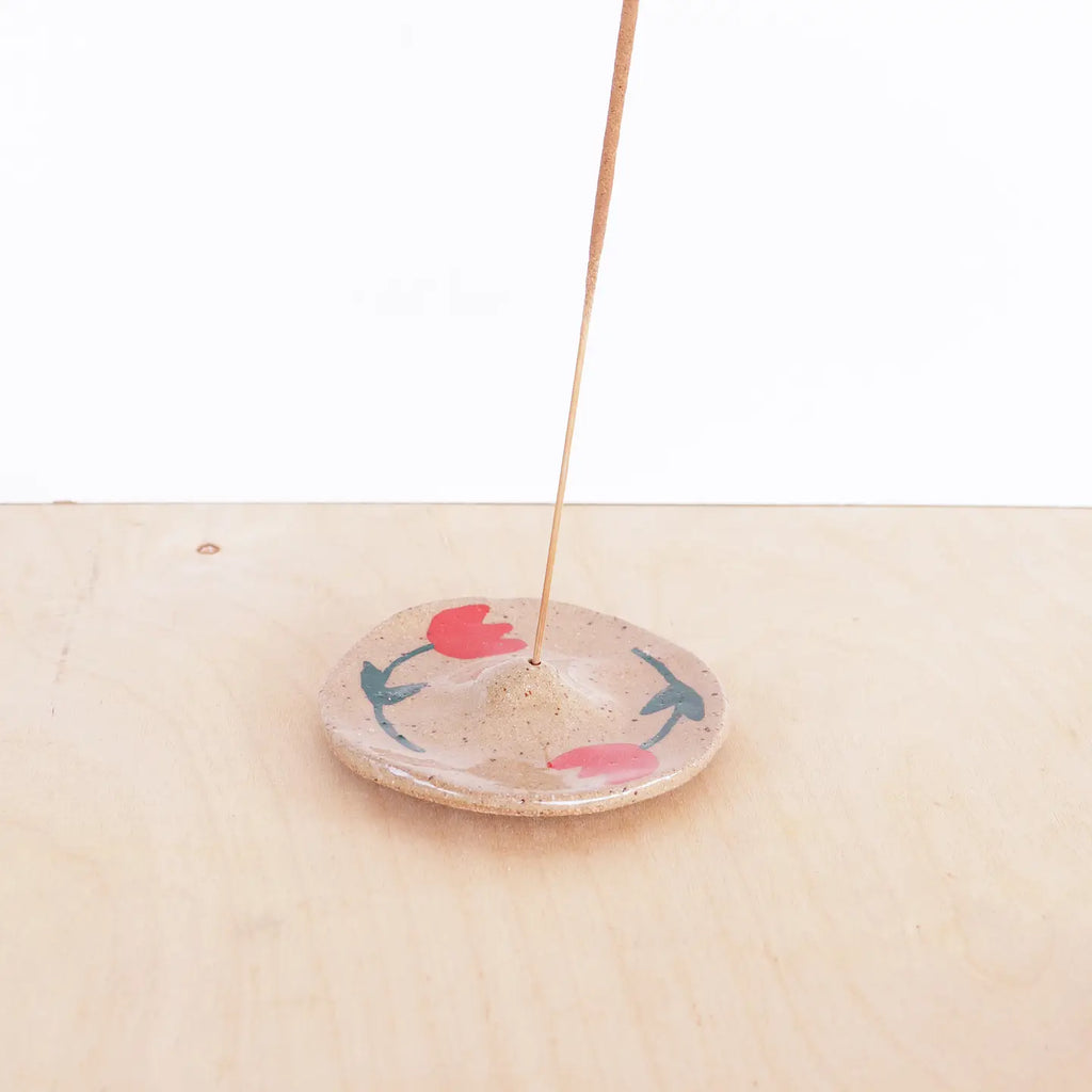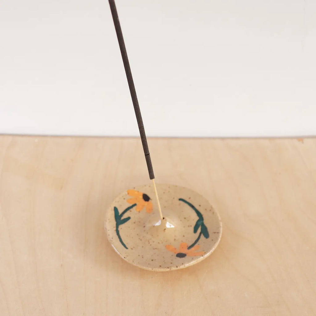 Modern, minimalist incense holders. Hand formed from speckled stoneware and finished with sunflower, tulip, or geometric design and clear glaze.