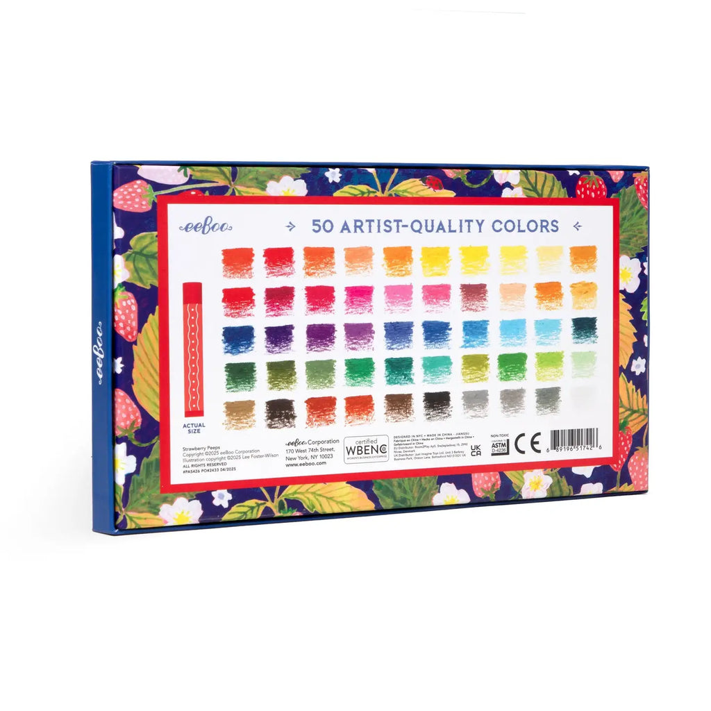 Artist-quality oil pastel sticks in a brilliant array of 50 fade-resistant, long-lasting colors. Packaged in a sturdy, two-piece box decorated with vibrant birds and strawberries by artist Lee Foster-Wilson. These pastels have a soft-touch feel and easy to blend, giving depth and subtlety to artwork on paper, canvas, or board. Pairs perfectly with the Seaside Peeps Hardcover Artist Sketchbook. * 50 artist-quality oil pastels * A beautiful, high-quality gift * Includes a sturdy, hardcover box for easy storage * Conforms to ASTM D-4236 Safety Testing * Pastel Size: 0.375" x 2.3” | Box Dimensions: 10.375” x 6.5” x 0.625”