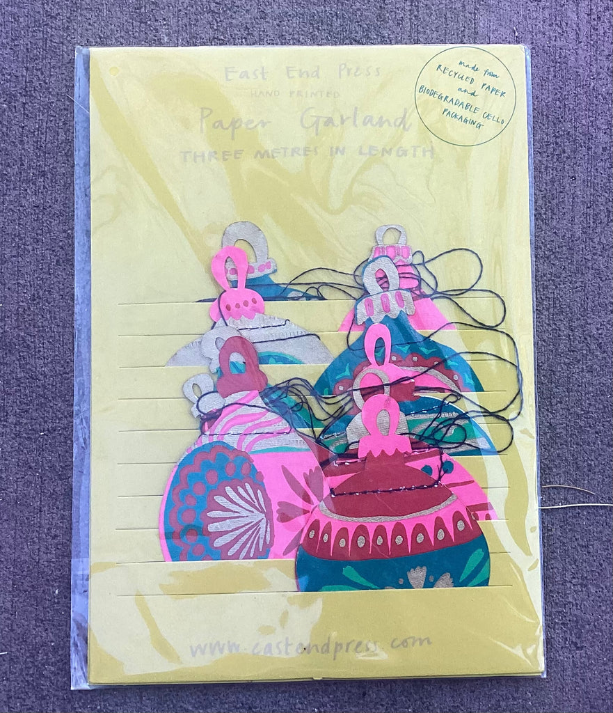 Hand printed three meter long paper garland, featuring 10 screen printed designs. The garland is printed on both sides on thick, hand made recycled cotton paper. The shapes are sewn in a random order along strong cotton thread, with hanging loops on either end, meaning the garland can be hung straight away!