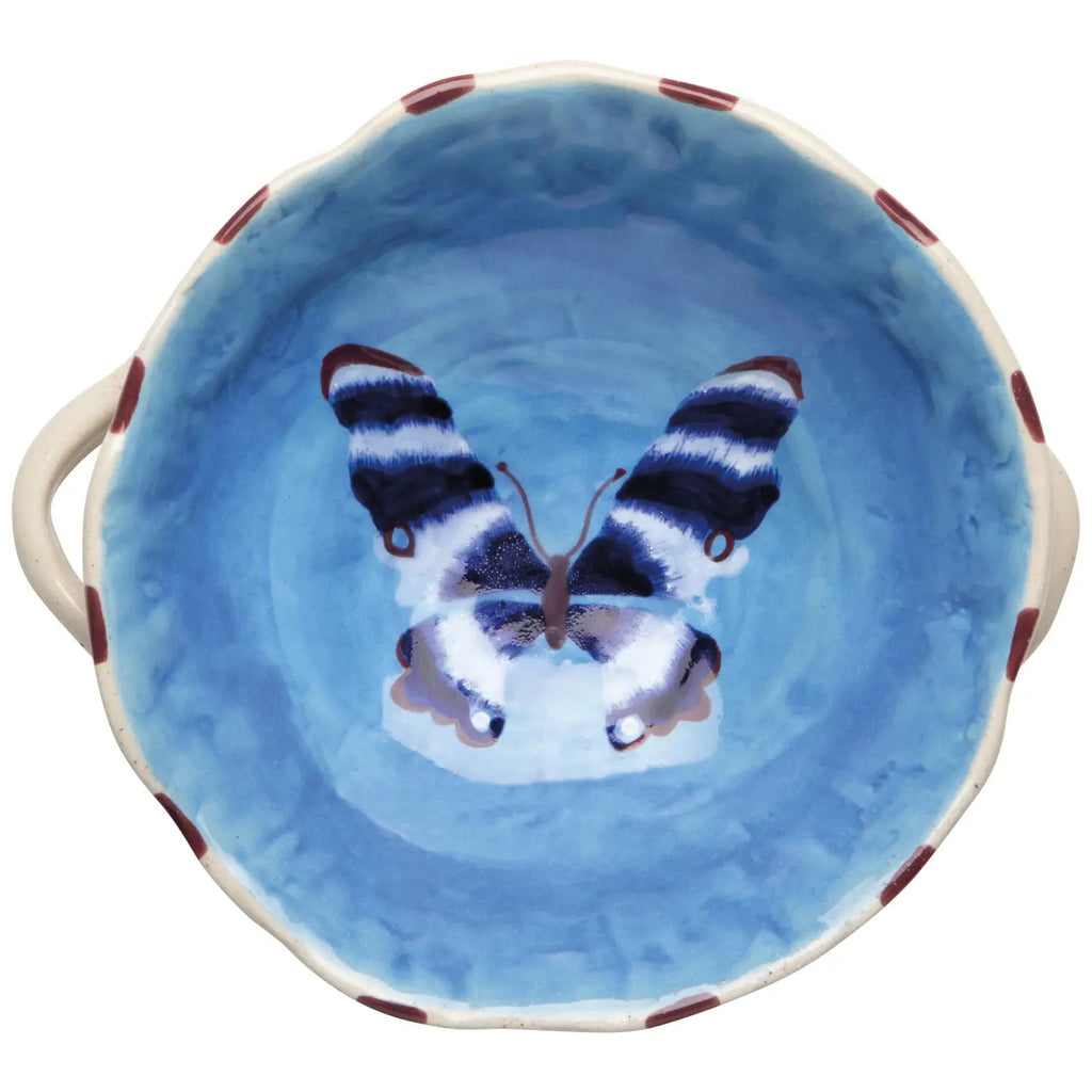 Elevate everyday rituals with our footed Aurora bowl, where a captivating creature guards precious keepsakes and daily essentials. An undulating surface, organically shaped edges, and a glossy finish provide a textural and handmade appeal. Made from 25% recycled stoneware. Spring dawns and a sunrise of color graces the butterflies wings in the Aurora design.