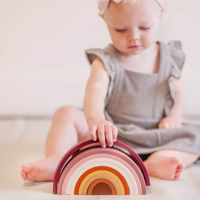A minimal and timeless design, our Desert Rainbow Stacker is suitable for babies and children of all ages. It can be used as a teether, stacker, bath toy, open ended play toy, and more. 10 pieces in total.