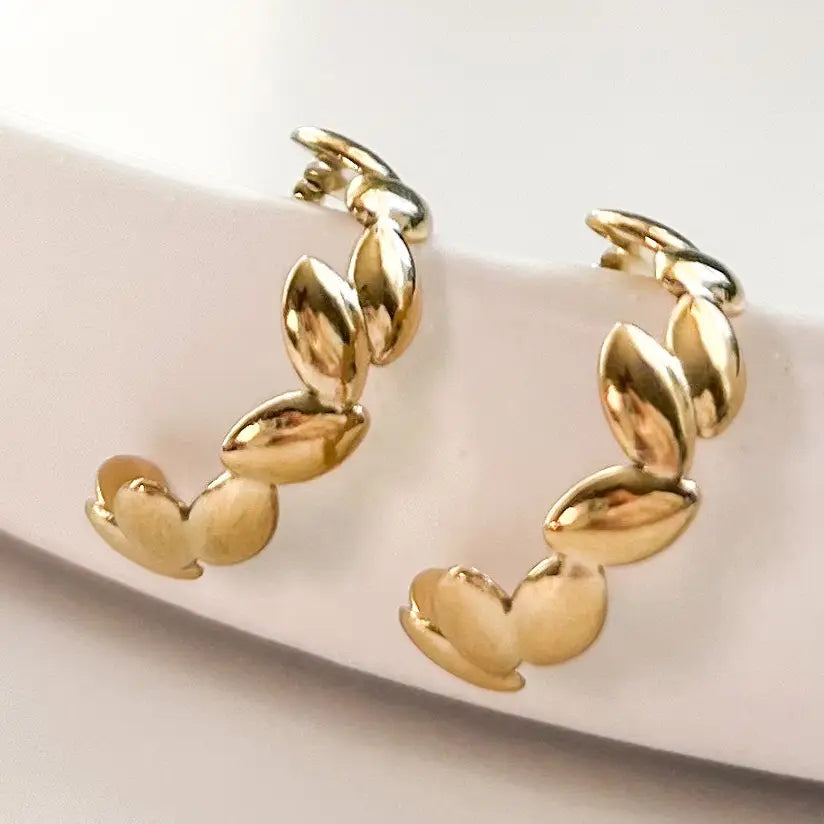 These leaf hoop earrings are made of gold or silver plated stainless steel. Perfect for the plant lover.