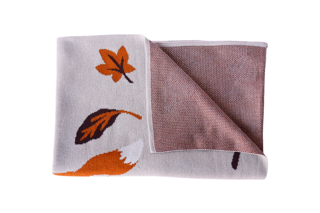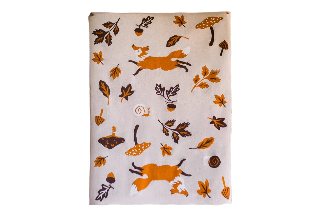 A cozy companion for every season, this cotton knit blanket brings warmth and charm to your little one’s world. The design features a cheerful fox leaping through a woodland of mushrooms and autumn leaves — a playful, nature-inspired print in rich, earthy tones. Made from 100% cotton knit, it’s soft, breathable, and perfectly sized at 30x40 inches — ideal for babies and kids alike. Whether tucked in the crib, draped over a stroller, or used for snuggles at home, this blanket offers everyday comfort with timeless style.