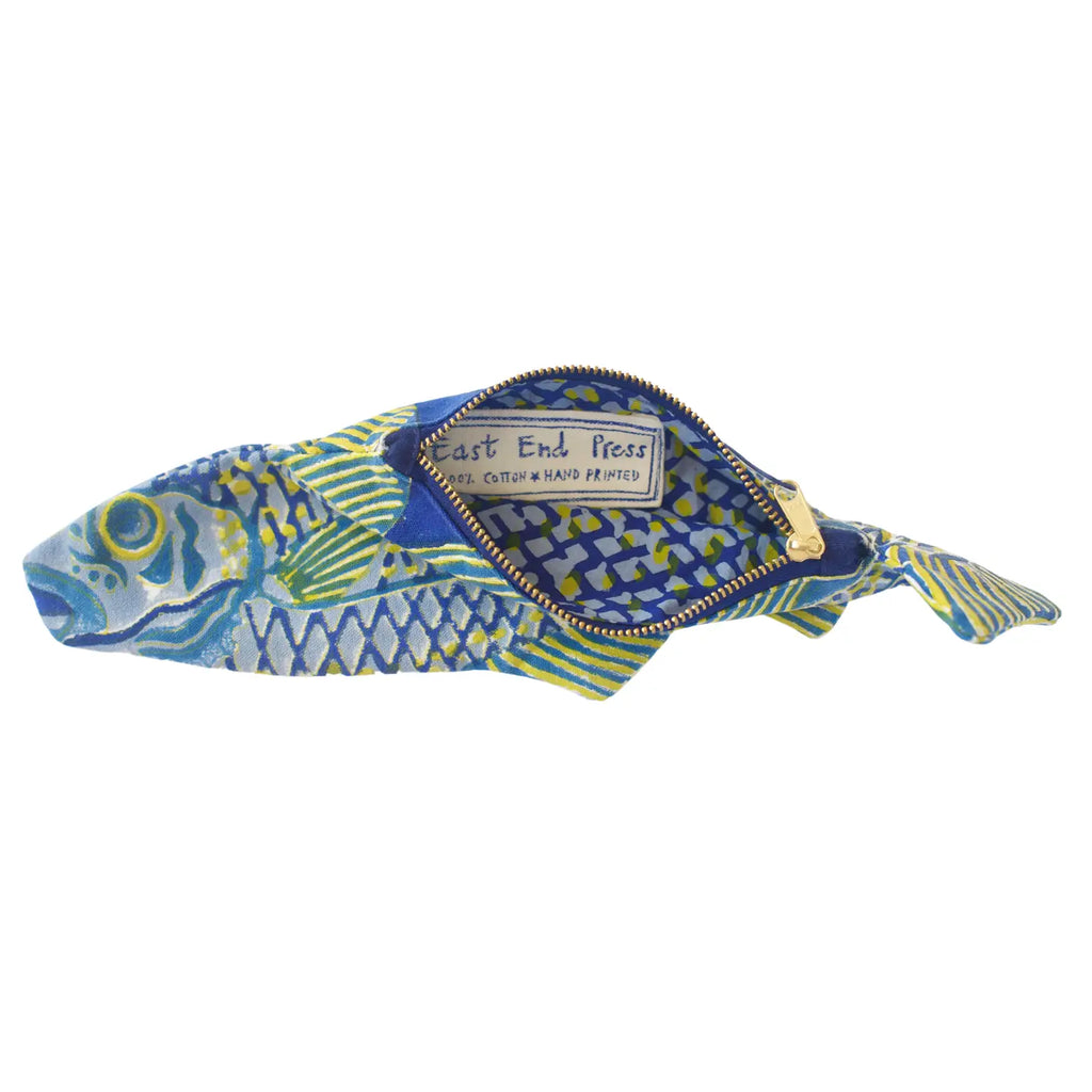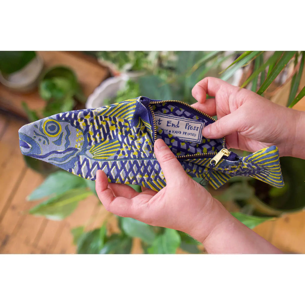 Hand printed using carved wooden blocks, this pouch is shaped like a fish and the perfect size for pencils, make up or cables and chargers. With a colourful cotton lining, and sturdy brass zip, this pouch is unique and beautifully made Minimum order: 6 - Illustrated fabric case, fully lined, 100% cotton - Block printed by hand on both sides by talented artisans in Jaipur - Shipped unpackaged with swing tag.