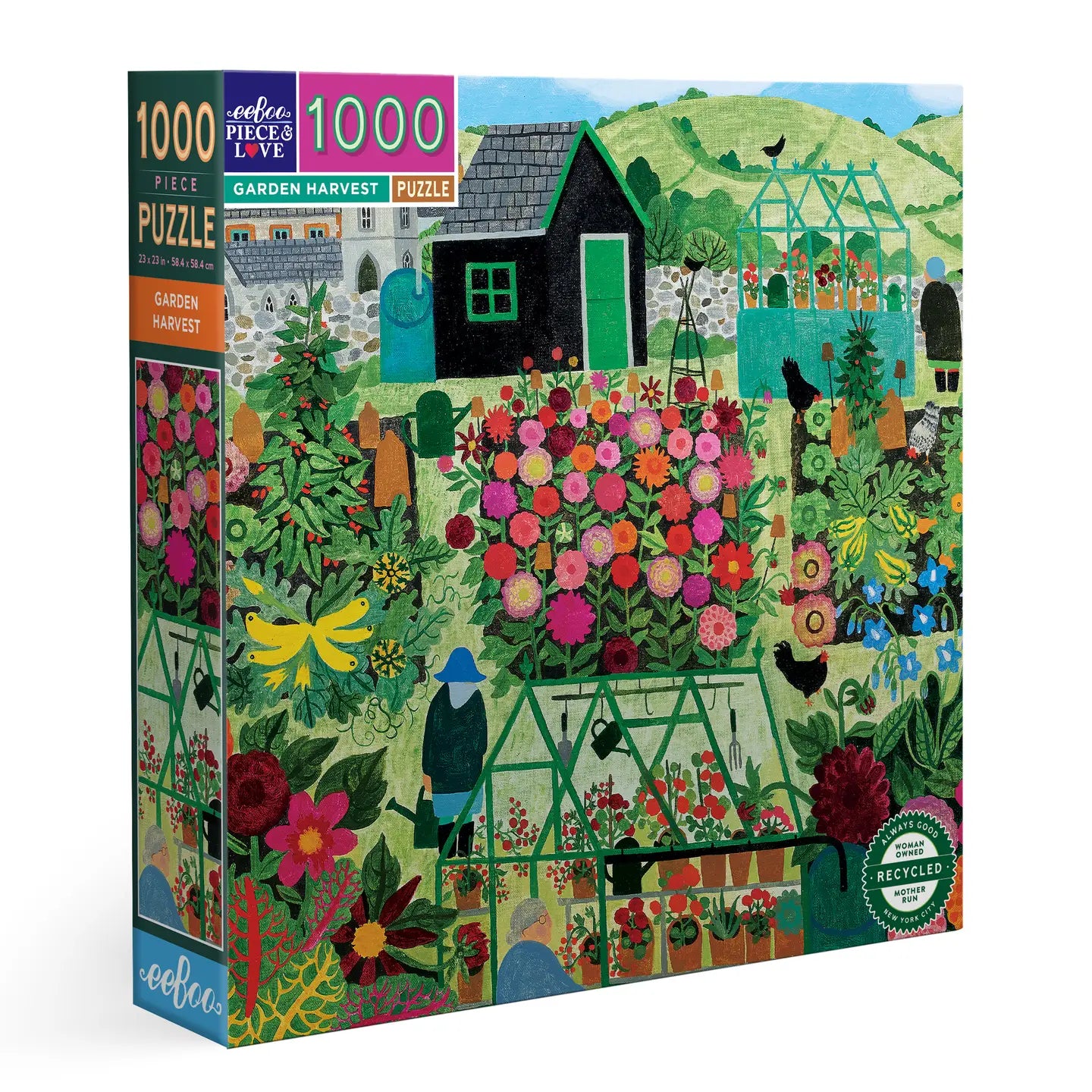 An English vegetable garden and greenhouse bursting with flowers and vegetables. Spot all the wonderful summer bounty and the careful caretaker with her gigantic watering can. Lovingly painted by English artist, Vanessa Bowman. •1000 sturdy, dustless pieces •Completed puzzle: 23” x 23” •Box size: 10” x 10” x 2” •Includes full-color insert for reference •Curated Artist’s Playlist via QR code on box •Sustainably Sourced: Made with recycled board and printed on FSC®-certified paper using vegetable-based inks