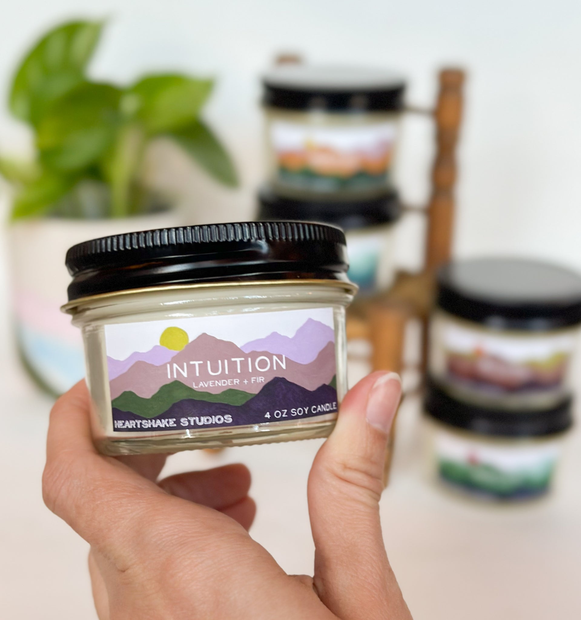 Our popular in-house candle line is now available in a smaller travel size candle! These candles are made right here in the Springs in collaboration with local candlemakers Good Intentions. Hand poured with no additives and 100% pure soy wax. Highly concentrated scent for your home. Clear glass jar with black lid and a colorful label designed right here at Heartshake Studios! Label was made from an original gouache painting of mountains by Kit Hutchinson and rendered in a variety of beautiful colors so each candle has a unique look.