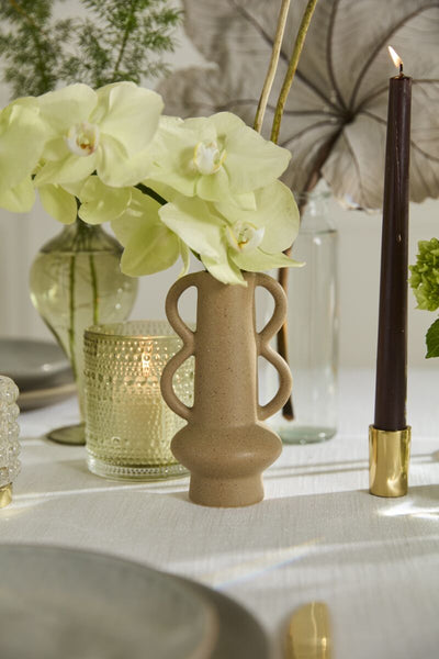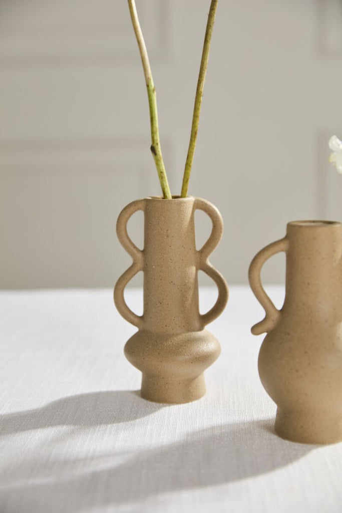 Petite in scale, but big on personality and design, the textured ceramic Maquette Budvase is a playful and versatile vessel for a few colorful fresh or dried stems. A rounded base, elongated neck with double handles on either side of the cylindrical opening give this small scale budvase lots of personality.