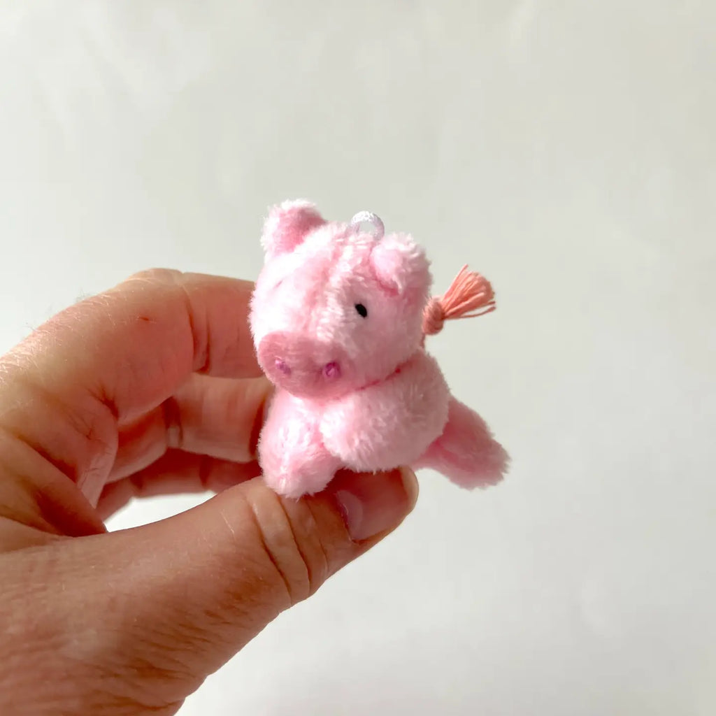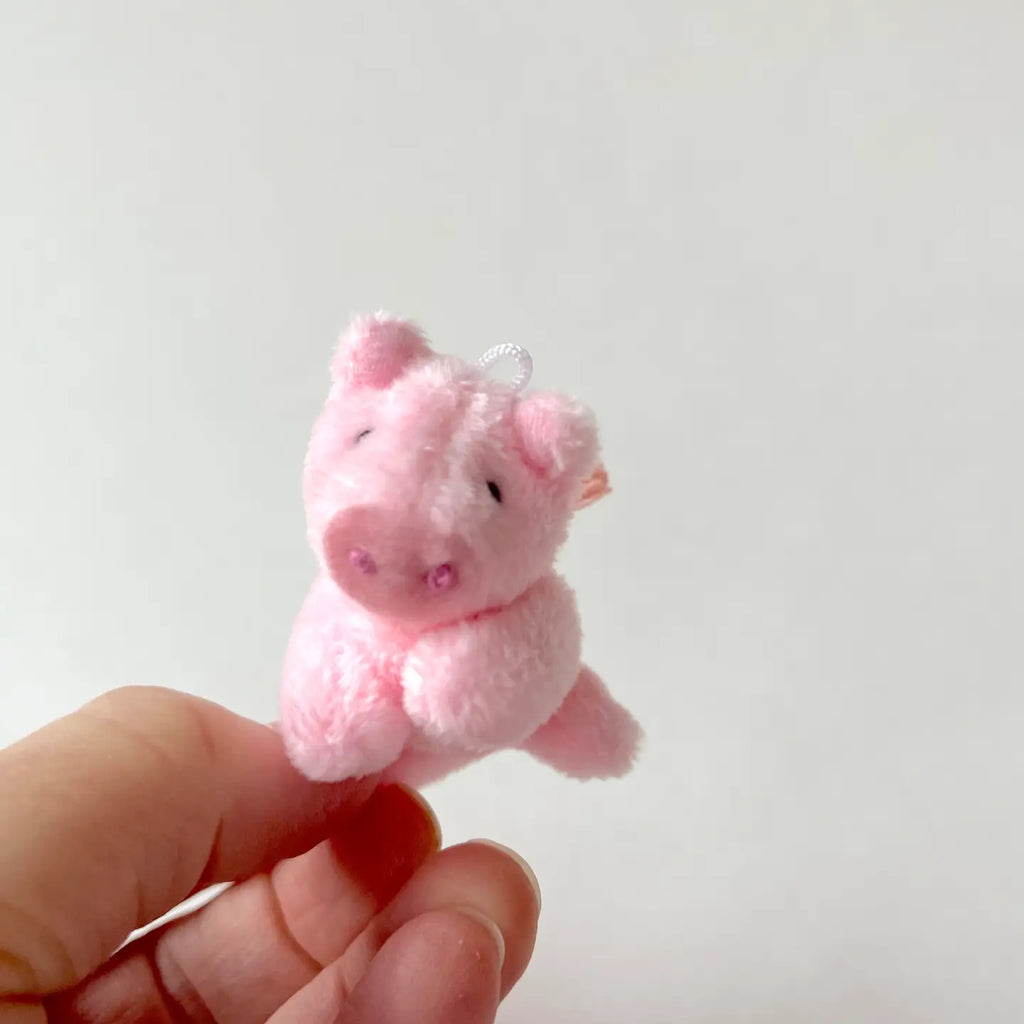 Miniature stuffed pig. Measures about 2 inches long. Each pig has front legs that move back and forth some. Loop on top to hook onto things. Adorable pig is perfect for travel. For dolls or dollhouses or use in a craft project. Or pocket friend. These are hand sewn.